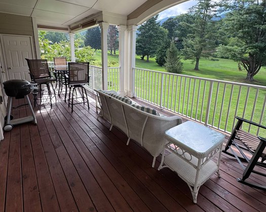 Welcome to a taste of the good life at 19th Hole 3 Bedroom Condo on the 9th Green! Sitting on the top floor, this stately 3 bedroom / 2 bath condo directly overlooks the 9th green of the Maggie Valley Club & Resort and is perfectly situated for one of the best views in the house. One of the few three-bedroom units at the resort, this property has a full-size living room with gas fireplace, recliner chairs and double reclining sofa, Smart TV with streaming TV service and other apps, and a Tall Vintage Cabinet with Hutch, Sliding Barn Door, LED Lights and a countertop ice maker. Open the French doors to walk out to a large, covered balcony for a perfect end of the day beverage or a morning cup of coffee, or just taking in that amazing Smoky Mountains view. Dine alfresco on the balcony on the high-top table overlooking the golf course or enjoy indoor meals inside on the formal dining table.