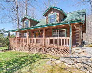 This beautiful log home sleeps 6. As you walk in the front door the first thing you see is the beautiful great room. The main level is an open floor plan that includes a large living room with a stone wood burning fireplace and a beautiful hand carved mantle, and a dining room opening onto the massive outdoor covered porch, perfect for sitting and taking in the view. This level also has a fully equipped kitchen, laundry closet with full-size washer/dryer and large kitchen pantry.